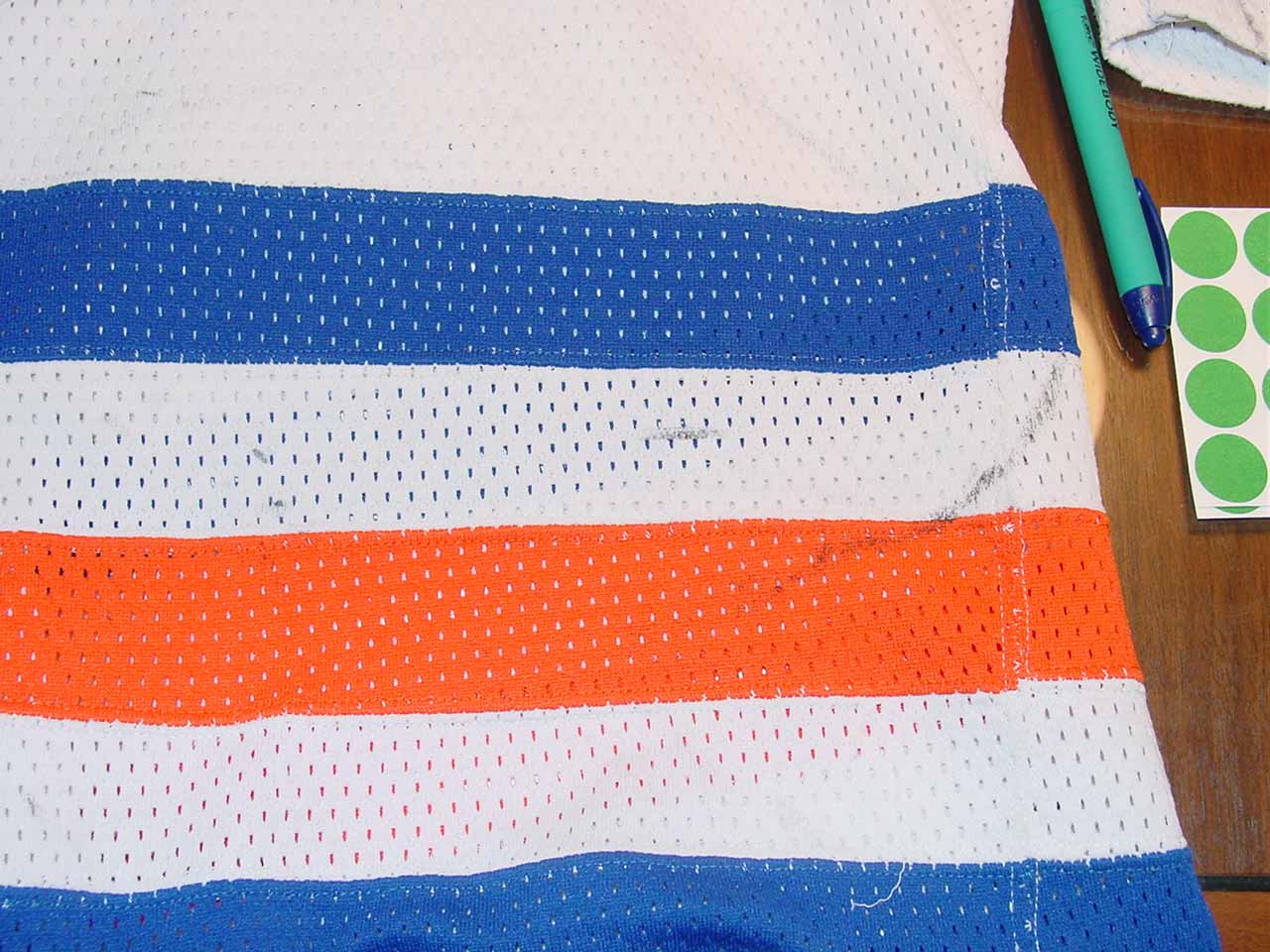 Black Marks – You will find black marks on jerseys. Mostly from the tape on opposing players sticks. These marks can be very useful when trying to photo match a jersey. The first large stick mark is from a Lindros jersey which is photo matched. The last is from a Lowe Oilers jersey photo matched to him holding the Stanley Cup in 87-88. mark large.jpg (35330 bytes) marks.jpg (83293 bytes)